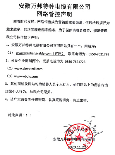 鄭重聲明:安徽萬邦特種電纜有限公司官方網站為:www_wanbangcable_com.6688007.cn,除此之外無任何子網站或合作網站,其余均為假冒偽劣。電話:0550-7621728 13485756353 地 址:安徽省天長市滁州高新技術產業開發區經四路29號